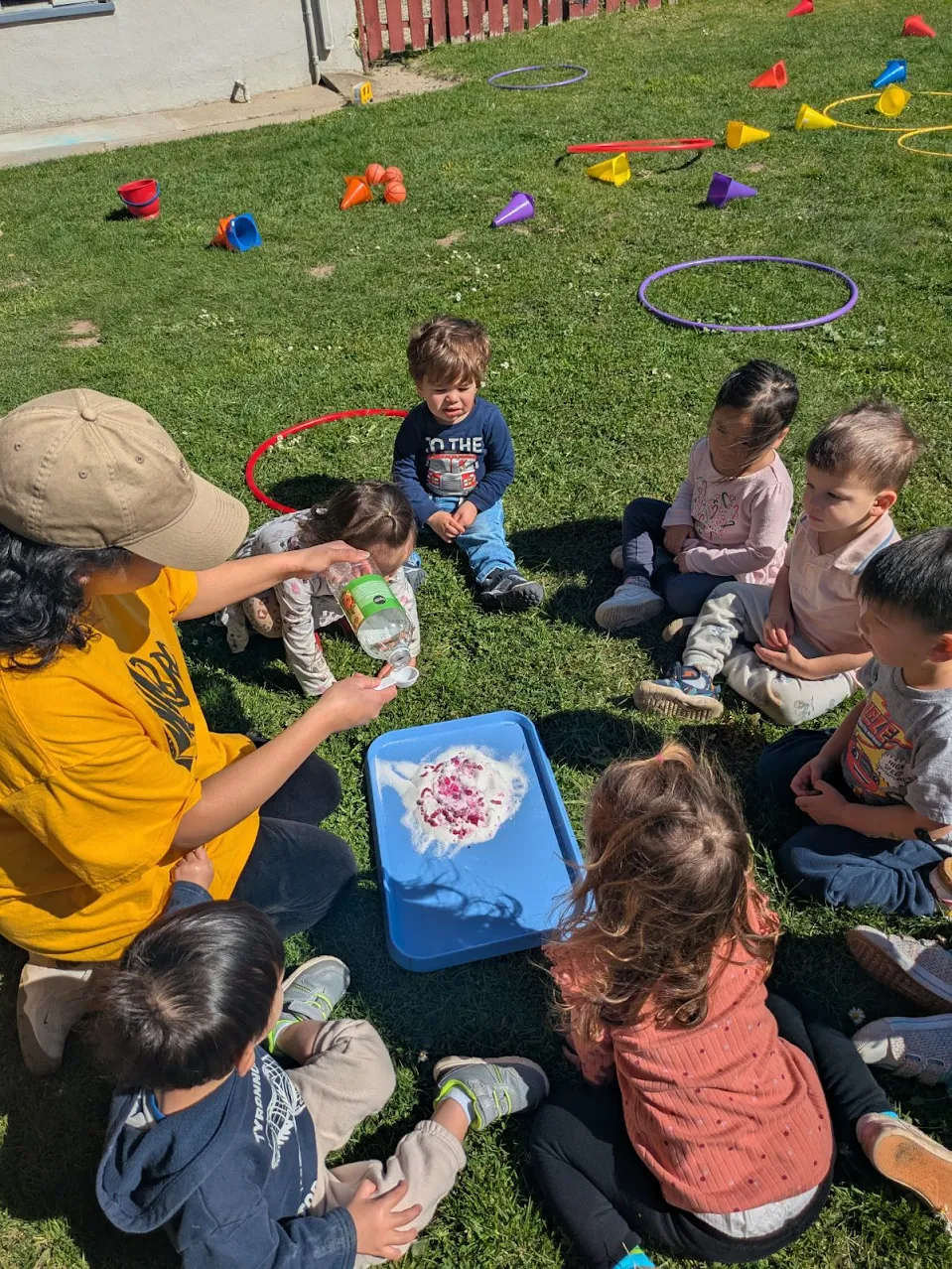 We also explored several fun and engaging science activities. One highlight was creating a rainbow using Skittles and water on a paper plate, allowing children to observe color blending in action. Another favorite was our “rainbow fizzle” experiment using vinegar and colored sugar, which introduced simple chemical reactions in an exciting, hands-on way.