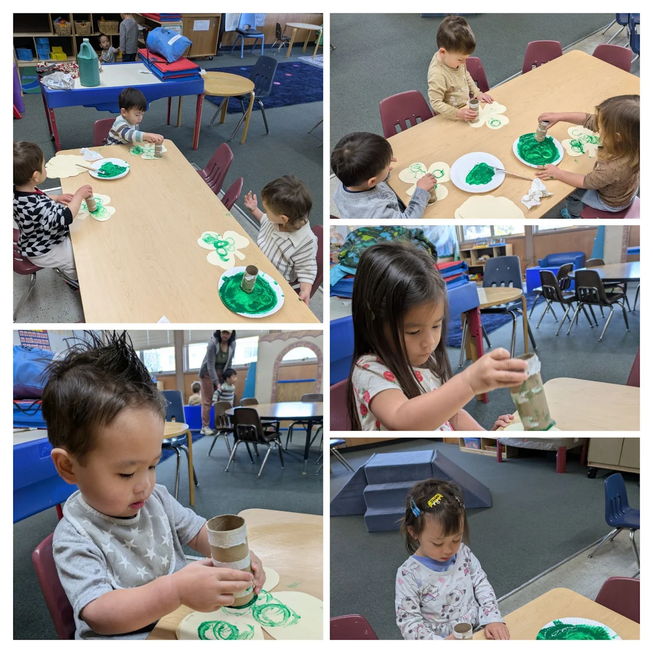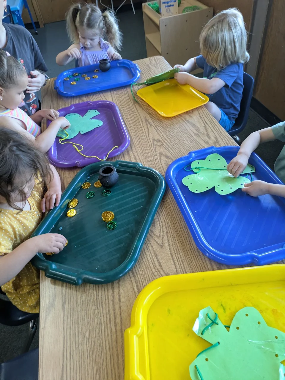 This month, our curriculum focused on colors, patterns, and early science exploration. In celebration of St. Patrick’s Day, children painted and stamped shamrocks, helping them practice pattern recognition and strengthen their fine motor skills.
